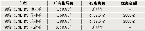 据吉利4S店销售人员介绍,吉利熊猫的低配车型和高配车型现在仍然没有现车销售。目前主推4.58万的灵动版和4.88万的乐动版,两款车型是销量最佳的车型,并有试驾车提供给客户体验。另外,销售人员表示,目前购买吉利熊猫系列车型4S最多可以优惠2000元现金。