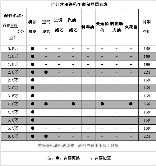 锋范车型的首保经销商建议在5000km或3个月时到店进行,其后每隔5000km做一次常规保养,这也与其他几款广本车型的保养周期是一致的,更多具体的保养细则和材料价格请看下表: