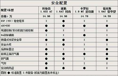安全配置方面,速腾仍然以其超越同级别车型配置的ESP系统而占有优势,主动安全配置方面四款车型都做到了ABS+EBD的组合。被动安全方面科鲁兹拥有同级别车型中最多的6只安全气囊,能够为前后排乘客提供更多的保护,德系车型的代表速腾也在被动安全配置方面提供了丰富的配置,相比之下丰田卡罗拉这款售价14.78万的GL-S运动型轿车被动安全配置比较少。
