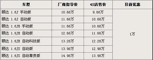 据东风日产4s店销售人员介绍,目前颐达全系车型现金优惠1万(报价 参数 图片 论坛)。经优惠后,入门级的1.6J 手动版车型售价从10.68万元下降到了9.68万元,高配的1.6JS 自动尊贵型售价也下降到了13.98万元。销售人员还介绍,目前店内没有颐达现车,欲购买者需交2000元订金约等一个月时间。