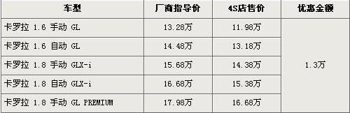 据4S销售人员介绍,目前店内卡罗拉全系优惠1.3万(报价 参数 图片 论坛),最低售价不足12万元。卡罗拉 1.8 旗舰版售价降为16.68万元。排量更小一级的1.6L排量车型经1.3万元优惠后,最低配的卡罗拉 1.6 手动版售价降为了11.98万元,已经不足12万元,1.6L自动档车型售价也降到了13.18万元。
