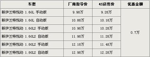 据北京现代经销商处销售人员介绍,新伊兰特悦动全系车型优惠7000(报价 参数 图片 论坛),经优惠后全系入门级的1.6L GL手动版的售价为9.28万元,是全系的最低价格。销售人员还介绍,1.6L车型现车充足,而1.8L车型店内现车有限颜色不全,欲购买无现车的1.8L车型消费者需交纳3000元现金,等一周后可提车。