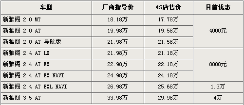 据4S店销售人员介绍,目前购新雅阁2.0排量车型可优惠现金4000元,2.4排量可优惠8000元,2.4EXL导航版可以优惠1.3万元。而3.5排量最高降幅达到了4万元。相比4月份的优惠幅度,价格并没有太多起伏。目前2.0排量多款车均需要预订,订金为2000元,半个月时间便可以交车。2.4L供车较为充足,4S店主要有黑色、银色等款可供选择,同时各店均能够提供试乘试驾服务。