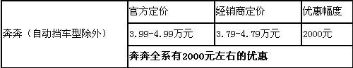 奔奔虽然有自动挡车型,但是因为自动挡车型成本过高,目前并没有大量生产,购买的客户还需要提前预定;而手动挡车型,奔奔全系有2000元左右的优惠。