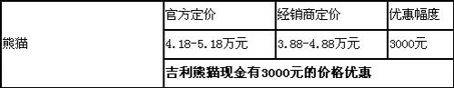 吉利熊猫目前市场价比较宽松,在现金3000元的价格优惠的基础上,还能有大约1500元的随车装饰赠送,并且目前熊猫市场供应充足,各种颜色和车型库存都比较大。