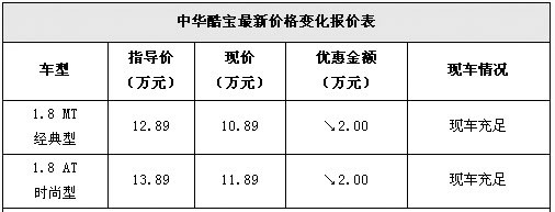 在自主品牌拥有跑车外型的在售车型中,中华酷宝(报价 参数 图片 论坛)比较受消费者的认可!近日,编者从上海华星中华4S店那里获悉,中华酷宝两款非运动型车型现车较为充足,优惠幅度在2万(报价 参数 图片 论坛)左右,最低售价已经不足11万元!具体详情请见下表: