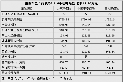 高尔夫(报价 参数 图片 论坛)6已于日前正式上市,全系8款车型售价为11.88-16.68万。其在动力方面分别搭载了1.6升自然吸气和1.4升燃油直喷涡轮增压两款发动机,与之相匹配的是5速手动和7速DSG双离合自动变速箱。那么在购买高尔夫6轿车后,其保险又将如何选择呢?下面我们将北京地区太平洋、平安、中保三家保险公司对高尔夫6入门车型的投保费用进行详实解析,以便为您购车提供一定的参考。