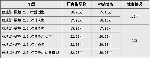 福特蒙迪欧-致胜(报价 参数 图片 论坛)出自福特最新开发的EUCD技术平台,它采用了沃尔沃S80底盘技术。在欧洲,蒙迪欧(报价 参数 图片 论坛)致胜与皇冠(报价 参数 图片 论坛)成为竞争对手,是一款定位高于雅阁(报价 参数 图片 论坛)、凯美瑞(报价 参数 图片 论坛)之流的轿车。近日小编获悉,蒙迪欧-致胜全系最高优惠2万元(报价 参数 图片 论坛),具体车型价格详情请看下表: