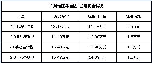 马自达3三厢是一款外形时尚充满了动感的轿车,操控也非常欧化,目前,该款车在广州市场的降价幅度加大,2.0车型最高优惠1.5万元,现车充足。