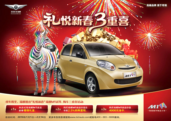 RIICH M1“礼悦新春三重喜”活动,将在全国各大城市同步启动。相信届时,3D精品小车——瑞麒M1必然将通过献给所有M1车主的这份2010年独特礼物,让更多的消费者爱上“天生独特、自然精彩”的独特理念!