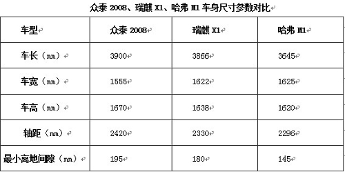 与众泰2008、瑞麒X1比较而言,哈弗M1车身最宽,在车长、车高与离地间隙上却是最小的,较宽的车体,有效的保证了驾乘人员的乘坐空间,使得后排能够乘坐多人,但较低的离地间隙又使得通过性降低,哈弗可能更为适合在城市路况下行驶。