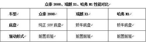 如果一个形象的说法来描绘三款车的性能的话,众泰2008堪称越野硬汉,瑞麒X1可以看成是跨界型男,而哈弗M1则是都市帅哥一名了。