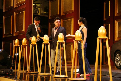 现场活动结束之后,剧场摇身一变成为中世纪的贵族餐厅。特殊设计的观众坐席整体下沉撤出,餐席徐徐移出并升起落定。客人们在此享用了奢华的宫廷晚宴。在晚宴环节,燕宝为所有当场签约的客户准备了惊喜的“砸金蛋”环节。舞台上一排10枚金蛋在灯光下熠熠生辉,客户在挥槌击落之后顿时金花四溅,每个金蛋里都有一个惊喜大礼。
