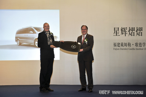 12月11日,福建戴姆勒与歌德学院(中国)交接第8888辆国产梅赛德斯-奔驰豪华商务车仪式在北京举行。戴姆勒东北亚投资有限公司董事长华立新、福建戴姆勒汽车工业有限公司总经理赖瑞宁、歌德学院中国区总院长阿克曼等出席了交接仪式。赖瑞宁表示,“第8888辆国产唯雅诺是具有特殊意义的一辆汽车,凝聚了中德合资双方的智慧和心血,是梅赛德斯-奔驰豪华商务车在中国快速成长的重要见证。将这款车作为促进中德两国文化交流的工作用车,是中德文化完美融合的又一次见证,并将促使中德之间的文化交流和友谊更加紧密和牢固”。