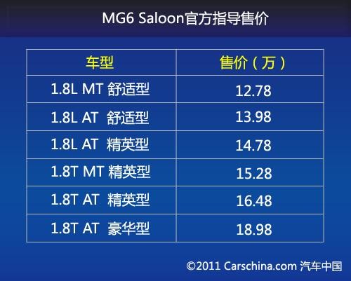 MG6 Saloon三厢版并没有举行隆重的上市仪式,显得水土不服的它也没有高调的资本。这次MG6 Saloon三厢版共推出了6款车型,售价12.78-18.98万元(报价 参数 图片 论坛)。