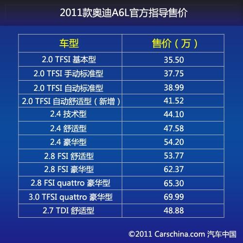 公务车老大奥迪A6L在年初也推出了小改款,继续巩固自己领先的地位,此次上市的2011款车型共有五个排量12款车型,售价区间为35.5-69.99万元,此次新增的车型有2.0TF(报价 参数 图片 论坛)SI自动舒适型。