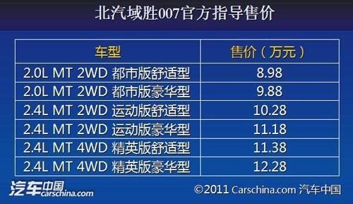 北汽域胜007老土的长相让小编比较不看好,在知名度不及竞争对手的情况下,除非你拥有娇好的外貌、超高的性价比,否则要想在竞争日趋激烈的SUV市场站稳脚跟并不是那么容易。北汽域胜007此次将推出6款汽油版车型,售价8.98—12.28万元(报价 参数 图片 论坛)。