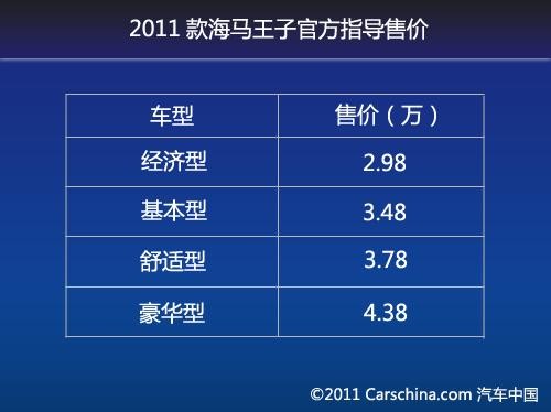 2.98万,是海马王子在北京车展中上市所发出的最强音,没有人会否认它的起步价极具诱惑力。刚步入2011年,海马就为我们带来了首款微型车产品—海马王子,此次上市车型共有经济型、基本型、舒适型、豪华型4个版本,售价为2.99-4.38万元。