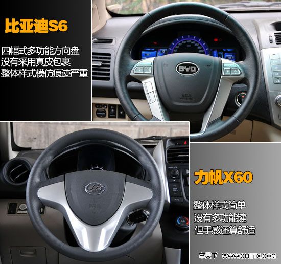比亚迪S6在方向盘上的优势还是比较明显的,虽然样式依然存在着严重的模仿痕迹,但是不妨碍消费者对其款式的喜爱,并且配备了多功能键,集成了音响控制、蓝牙控制、摄像头控制、定速续航控制,唯一的缺点就是没有采用真皮包裹,手感一般。相对于比亚迪S6的豪华,力帆X60(报价 参数 图片 论坛)的方向盘则朴素了很多,没有装配功能键,仅仅用银色装饰板简单衬托下城市SUV的氛围。