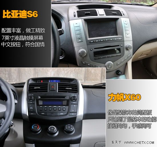 内饰的整体设计还是能明显的看出两款车有着不小的差距,两车都定位城市SUV,因此不约而同的选择了上深下浅的颜色搭配,这也是主流家用范的配色选择。比亚迪虽然是第一次产SUV车型,但是凭借着丰富的的造车经验,比亚迪S6(报价 参数 图片 论坛)的接缝工艺明显提升,加上多种电子设备的运用,完全能够与合资车媲美。而同样是第一次产SUV的力帆就没有那么出众的表现,首先在内饰造型上就有某款车雷同,没有摆脱模仿的痕迹,其次是装配工艺还真的是有待提升,不得不说力帆在某些方面还是比较欠缺的。