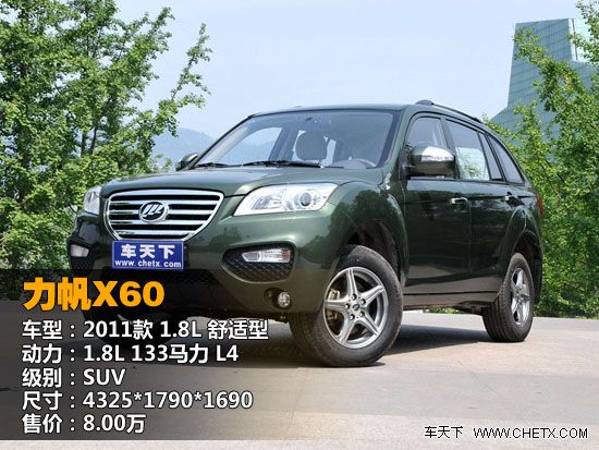或许出于自身实力和品牌影响力的情况,力帆X60(报价 参数 图片 论坛)并没有提供多种车型让消费者选择,目前在售车型只有一款,为力帆X60 2011款 1.8L 舒适型,厂商指导价为8.00万元(报价 参数 图片 论坛),在如今的汽车市场这种现象还是比较奇怪的,不过在经过一段时间的销售和反馈,相信厂家会针对市场推出更多的车型。