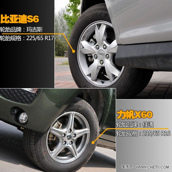 先不说轮胎尺寸和规格,从直观感觉上说,比亚迪S6的轮毂设计要比力帆X60好看很多。比亚迪S6采用五幅花瓣式轮毂,可以看出还是经过了一番设计的。而力帆X60就相对平庸很多,五星状轮毂虽然并不难看,但是已经见过太多车型运用此种设计了,不免有些审美疲劳。比亚迪S6的轮胎规格为225/65 R17,力帆X60轮胎规格为215/65 R16,从相同的扁平比上能看出,两车更注重日常行驶的舒适性。虽然扁平比一样,但是比亚迪还厚道一些,采用了17寸轮胎,而力帆X60只有16寸。