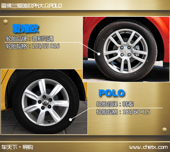 两车的轮毂都平淡无奇,没有什么特点。轮胎尺寸方面爱唯欧略胜一筹,规格为16寸,而POLO只有15寸。主打运动小车的爱唯欧其轮胎扁平比自然要比POLO小些,但是从轮胎花纹上来看,依然是一款偏重舒适的轮胎产品。