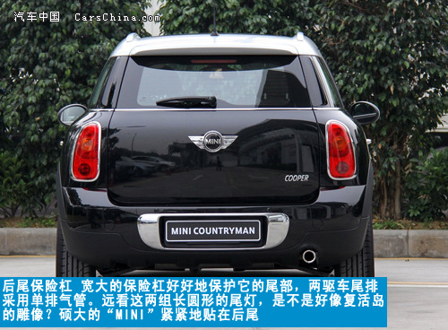 转到M.C的尾部,看到胖呼呼的尾部能让你不疯狂吗?圆弧型的尾部和厚实的前脸很好地搭配在一起,与娇小的MINI形成较大的反差。外沿加镀铬银处理过的两组后大灯很好地“站”在车尾两角,后面粗犷宽大的后尾保险杠似乎要跟世人说:“从今以后,我就是成年人” 四轮版的M.C采用更凶猛的设计,双排气管。