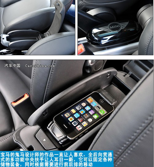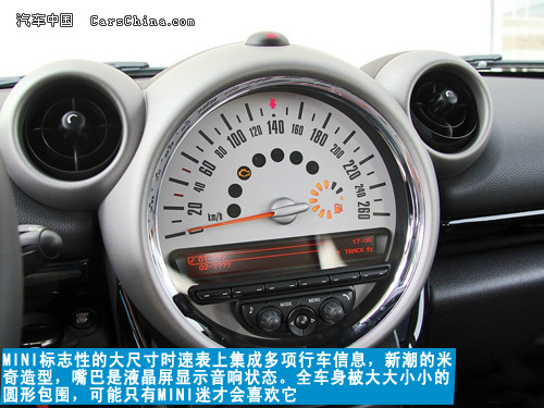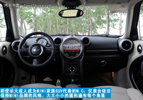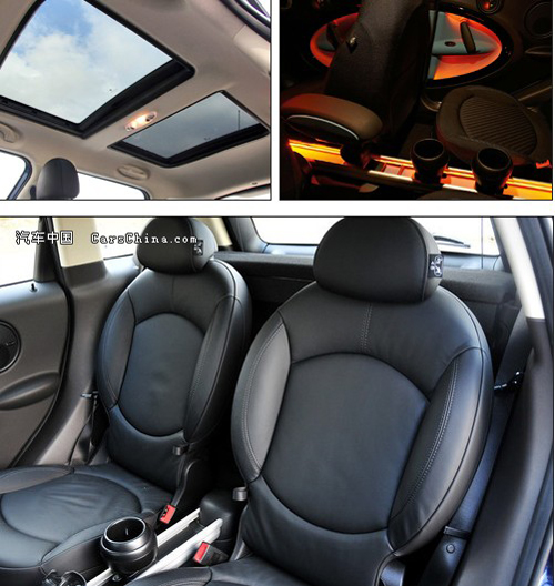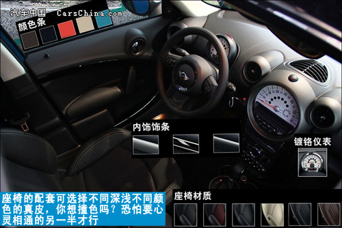 内饰风格同样进行个性化的定制,仪表台依旧保持MINI品牌的风格,大大小小的圆形遍布车内每个角落。转速表被安排在后方,纯真皮包裹的多功能方向盘,中控密密麻麻的开关。让人差点忘记它是一台SUV运动车系。非常佩服宝马设计师的创意,中控台最显眼的时速表,不是因为它样子“大”,与头上的两个空调出风口搭配一起,简直就是活生生的米奇老鼠呀!这已经不是一台普通的SUV。座椅的配套上宝马可谓尽职尽责,可选择不同深浅不同颜色的真皮,看上去很柔软舒服,小车般的配套,大车的风格。你想撞色吗?恐怕要心灵相通的另一半才行。