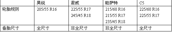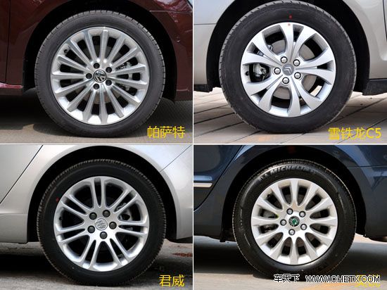 关于轮毂样式,编辑也不做过多评价了,从轮胎规格上来看全新帕萨特最为丰富,最低配采用215/60 R16,最高配采用235/45 R18,主流车型采用215/55 R17,这样一看虽然并不十分突出,但也算合理。君威和C5均有两种规格的轮胎可以选择,高配采用的分别是245/45 R18和225/55 R17。昊锐则在轮胎规格上稍显劣势,只有一种规格可供选择,但是在备胎尺寸上昊锐全系采用全尺寸备胎,也算是和其它三款车型平分秋色了。