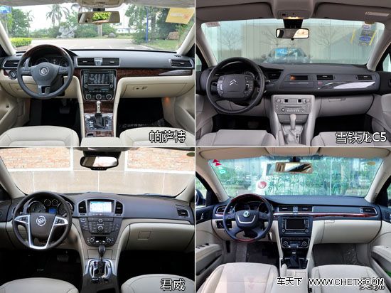 相比上一代车型,全新帕萨特的外观变化无疑是非常明显、也非常成功的,但是走进车内这种新鲜感会有小小落差,方向盘、变速器、中控台这一切都有熟悉的感觉,如果为这种设计找一种理由的话,编辑只能说为了“保持大众风格”。C5的内饰设计编辑只能说很“法国”,方向盘以及中控的设计都是那么的特立独行,对于一般的中国消费者来说,我们的确还需要更多的时间去适应。君威的内饰与动感的外观很好地统一在一起,唯一的缺点就是中控台上的按钮过于密集。由于昊锐采用大众的模块化生产方式,内饰风格与大众系其它车型相似也是情理之中,但是斯柯达的设计师们并没有照搬大众的中控,而是针对昊锐的外观及定位做了细致调整,如:方向盘采用四幅设计,与沉稳的外观形成统一。与其它大众系车型略显平庸的仪表台相比,昊锐的双炮筒造型加镀铬装饰显得十分时尚,透露出其全系搭载TSI发动机。