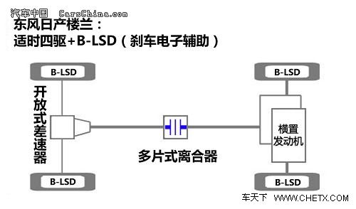 楼兰所搭载的四驱系统为适时四驱带有中央差速器锁止机构。这套四驱系统的几个主要结构为中央多片式离合器、B-LSD车轮制动限滑系统与中央差速器电子锁止机构。这些都与奇骏(报价 参数 图片 论坛)的四驱系统保持一致,其实用性也得到了很好的印证。
