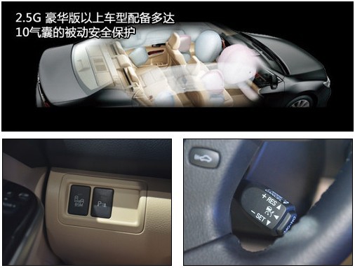 2.5G 豪华版在2.0G 豪华版基础上增加2万,除了动力升级外,增加了众多安全配置,如VSC车身稳定控制系统、侧气帘、后排侧安全气囊和定速巡航等。