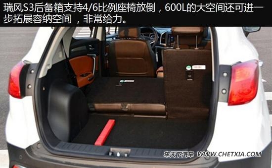 过年必不可少的两项是备年货和走亲戚,那么这个时候购车就不得不考虑空间问题。说到瑞风S3这款车的空间,亮点也不少。车身尺寸为4325×1765×1660mm、轴距2560mm,在同级别小SUV中的表现还是很出色的。若是考虑到储物问题,600L的后备箱支持4/6比例座椅放倒,而车内大大小小的储物空间也很丰富。以这样的乘坐和储物空间来看,支持过年时的家庭需要应该是不成问题的。