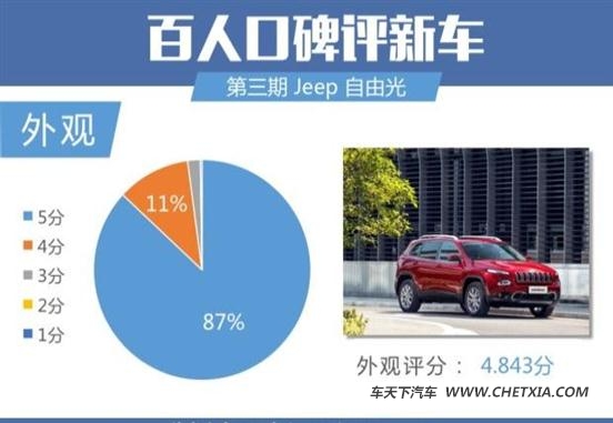 由上图可知,广汽菲克jeep自由光的综合评分为4.433分,而细分到每一个单项来说,车主们对于国产自由光外观和操控的评分较高,分别为4.843分和4.653分;对其性价比、外观、内饰和油耗四个选项的评分相对较接近平均分;而用户对于该车空间和动力的评分相对较低,分别为4.005分和4.081分。下面我们就具体来看看每一项的具体情况。