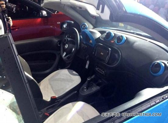 在车内,smart fowtwo敞篷brabus版采用黑蓝搭配,配备空调及多媒体套件、led及传感器套件,电加热座椅等配置。