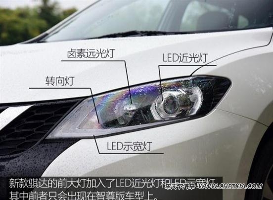 其中新车前大灯组增加led日间行车灯和led近光灯,使得新车看起来更加有神,不过该配置仅出现在新款骐达的顶配车型之上。