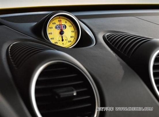 进入车内,718 boxster s同样是以黄/黑双色搭配为主色调,仪表盘及sport chrono组件的表盘为黄色,gt运动方向盘则采用alcantara材质包裹,同时该车内饰还覆盖了大量碳纤维材质。