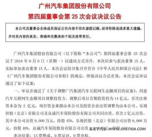 6月6日晚,广汽集团正式发布公告称,公司董事会审议并通过了《关于调整广汽集团汽车互联网生态圈项目的议案》。公告正式公布了广汽集团汽车互联网生态圈项目将由广州汽车集团股份有限公司、乐视控股(北京)有限公司及众诚汽车保险股份有限公司共同出资。