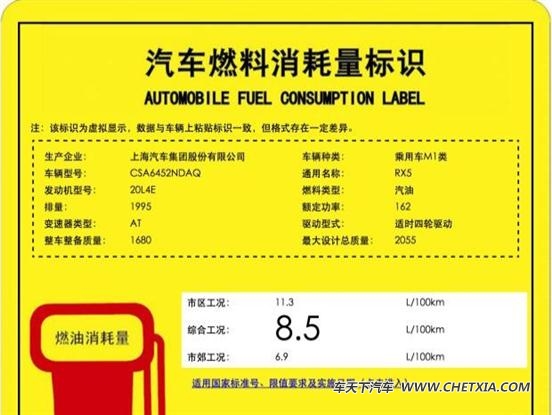 『配图为rx5 1.5t手动挡车型燃料消耗量标识』
