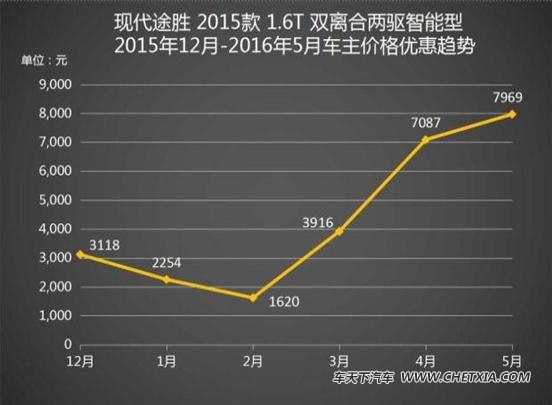 从我们网站收集到的车主价格来看,途胜的价格优惠从今年2月份开始一直出现大幅攀升的势头,尤其是3-4月份让利有了大幅增加,而进入5月份之后这个趋势依旧延续,同时结合我们的购车管家的价格看,6月份的让利增幅仍是很大。综合来说,途胜在今年优惠幅度出现了逐步增加的情况,预计在7月份也可能有相近的让利幅度。