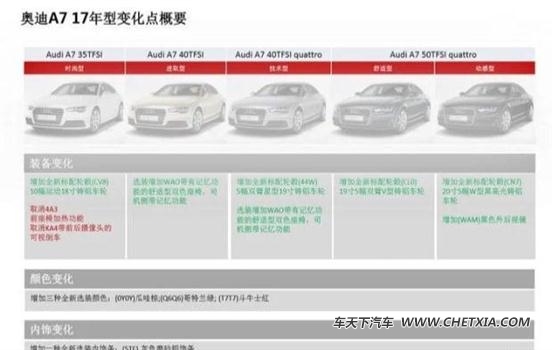 日前,我们从相关渠道获取到了奥迪新款a7的相关配置信息,新车增加了外观和内饰配色,配置方面也有所改动。