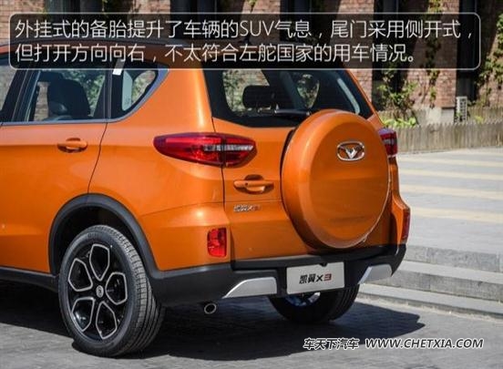 凯翼x3是一款主打年轻市场的小型suv,这款车的前脸设计在很大程度上保留了i-cx概念车的语言,飞翼形的镀铬装饰配合网状格栅富有个性。在尾部,这款车采用的是侧开尾门设计,同时还悬挂了备胎。