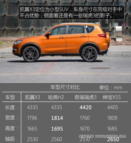 面对中国品牌小型suv市场,凯翼x3的竞争对手主要会有绅宝x35、长安cs35、力帆x60、瑞虎3(报价 参数 图片 论坛)、中华v3等。相比于竞争对手,凯迪x3在尺寸和空间方面并没有太大的优势,其主要会通过年轻化的外观设计以及较高的科技配置来与对手展开厮杀。