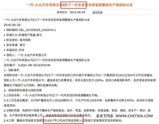 日前,我们在网上获悉了一汽-大众全新cc车型项目招标的信息,其中提到焊装调整线需要在2017年1月20日验收,也就意味着全新cc有望在2017年上半年实现国产。