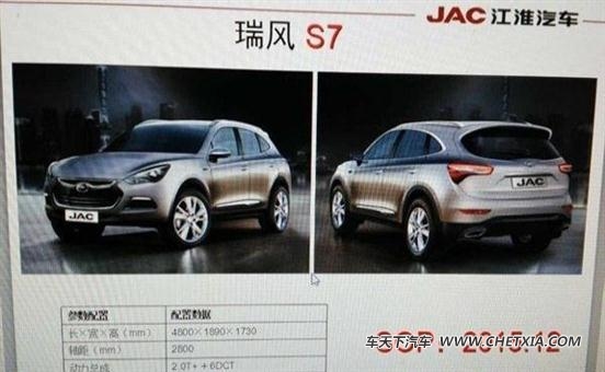 从之前曝光的江淮内部资料来看,瑞风s7的长宽高分别为4800/1890/1730mm,轴距为2800mm,动力方面,瑞风s7将搭载一台2.0t涡轮增压发动机,传动系统匹配6速双离合变速箱,不过具体动力参数目前仍是未知数,有关瑞风s7的更多消息,我们将保持关注。