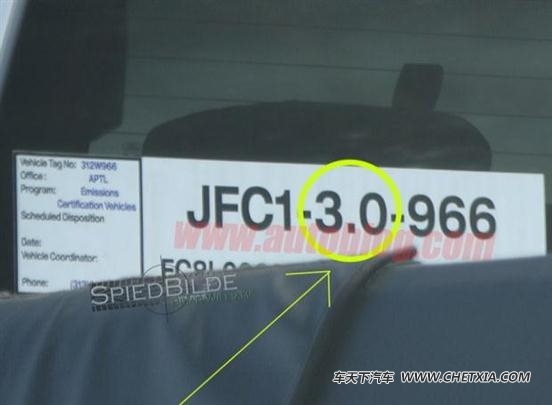 同此前曝光的谍照一样,这款测试车也在车身的一些部位进行了伪装,不过总体来说,新款车型并不会发生太大的变化,依旧保持高大威猛的范儿。不过在这款测试车后挡风玻璃的标签上,我们看到了“jfc1-3.0-966”的编号,中央的“3.0”表示该车搭载的是排量为3.0l的发动机。