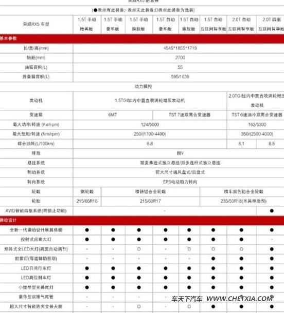 荣威rx5将于7月6日正式上市,而近日我们获得了疑似新车的配置表,新车将推出两种排量共计8款车型,此前官方曾公布2.0t两驱互联网智享版售价将不高于17万
