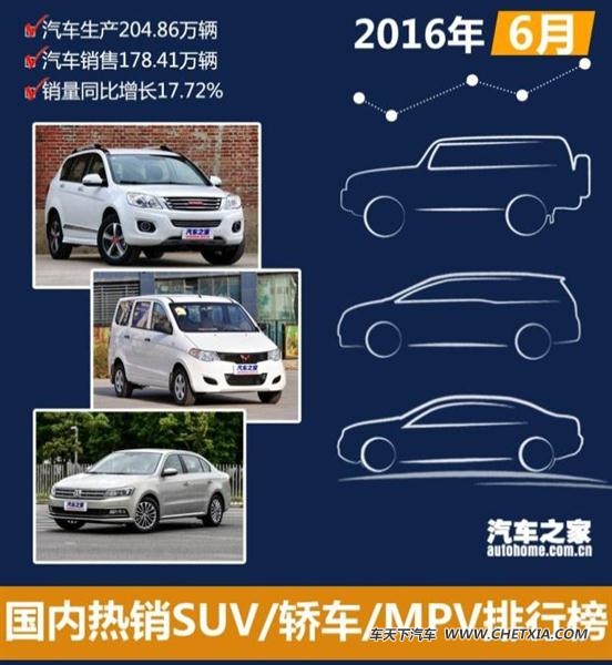 2016年6月国内热销SUV/轿车/MPV排行榜