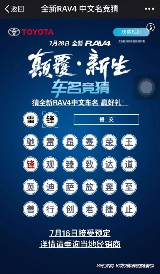 日前,我们从一汽丰田官方获悉,新款rav4车型将于7月28日正式上市,届时新车将拥有新的中文命名,该车于7月16日开始接受预订。根据目前了解到的信息来看,新车的新中文命名为两个字。